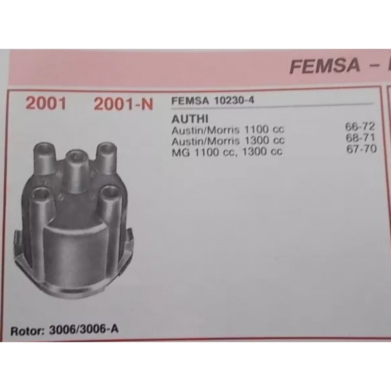 Tapa delco o del distribuidor FEMSA referencia 10230-4 para Austin/Morris 1100cc del 66 al 72. Austin/Morris 1300cc del 68 al 71. MG 1100cc del 67 al 70. Valido para rotor 3006/3006A. Nuevo de antiguo stock.